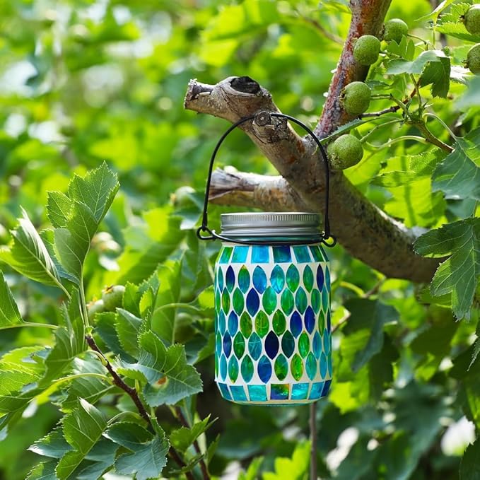 - UNIQUE MOSAIC SOLAR LANTERN. Each mason jar hanging solar lights is carefully handmade by workers and each glass piece carefully selected and manually set in weather-resistant mortar. In vibrant blue and red hues respectively, they perfectly capture the sunlight and sparkle in the sun, enhancing the natural beauty of your outdoor decor