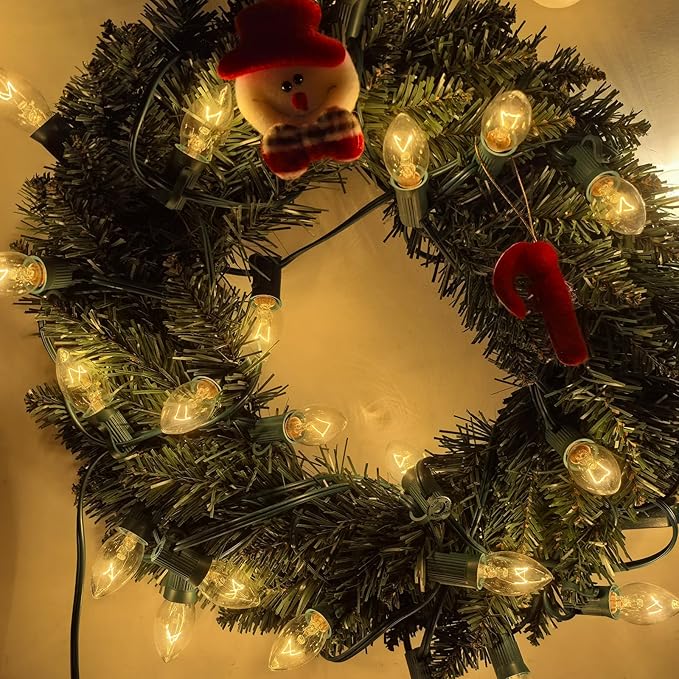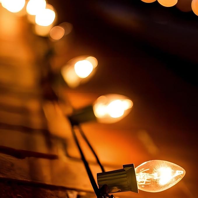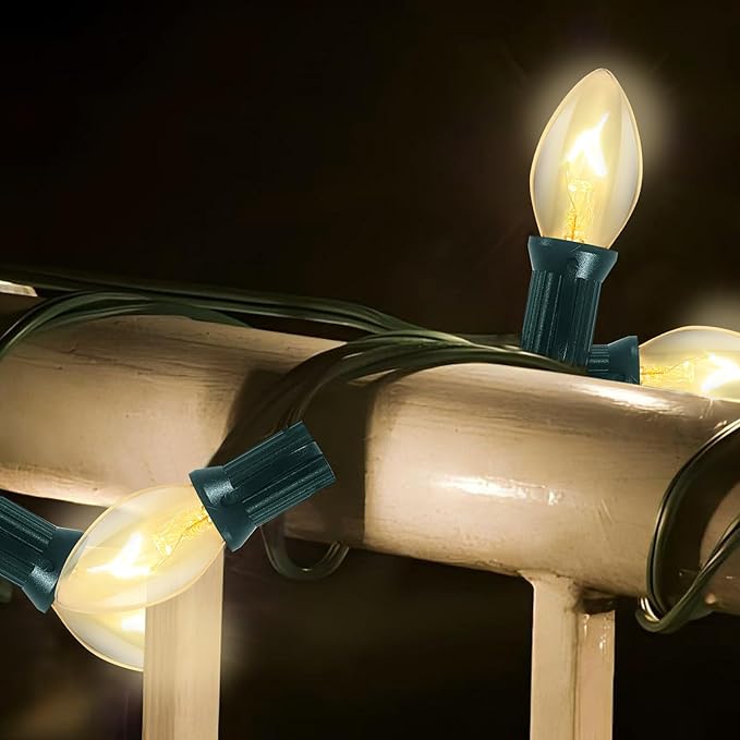 - 25FT Outdoor String Lights: This light set includes 25 clear C7 bulbs, spaced evenly along a 25-foot green wire, providing ample coverage for decorating Christmas trees, rooflines, fences, or patios. Perfect for creating a cozy and inviting holiday atmosphere.