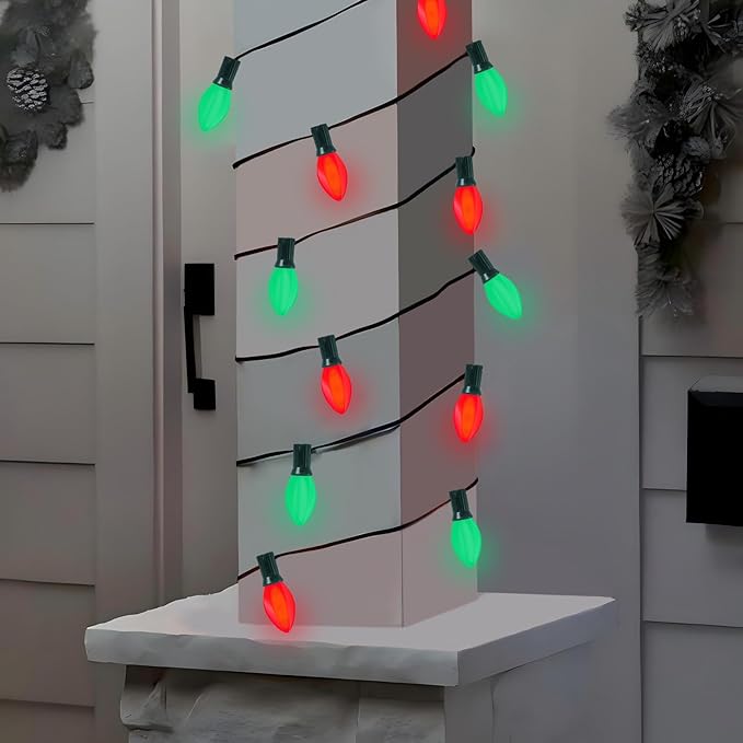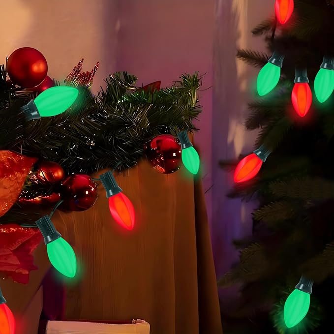 - Classic C7 Red and Green Christmas String Lights: Add a festive touch to your home with these 25FT C7 LED red and green Christmas lights. The alternating colors bring a traditional holiday feel, perfect for Christmas trees, garlands, and outdoor displays. perfer for decorating your home, store, backyard, garden, patio, wall, gate, yard, Christmas tree, window, party