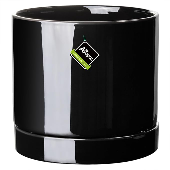 Aveyas 10 inch Ceramic Plant Pot with Drainage Hole and Saucer - Suitable for Indoor and Outdoor Use, Modern Planters for House Garden Flower Tree Snake Monstera Plants (10", Glossy Black)