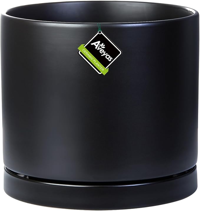 Aveyas 8 inch Ceramic Plant Pot with Drainage Hole and Saucer - Suitable for Indoor and Outdoor Use, Modern Planters for House Garden Flower Tree Snake Monstera Plants (8", Matte Black)