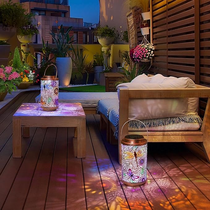 Go2garden 2Pack Solar Outdoor Lanterns Waterproof Dragonfly Garden Gifts for Women Patio Decor Lights Metal Lantern for Yard, Tabletop, Porch, Outside,Mothers Day Gifts for Mom Women