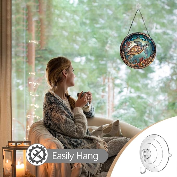 - 【Stained Glass Window Hanging】This is a very beautiful sea turtle decor suncatchers with a size of 6x6 inches, which is perfect for windows, adding a touch of color without obstructing the view outside. The beautiful sea pattern is sure to bring you joy and happiness, creating a harmonious and energetic addition to your space.