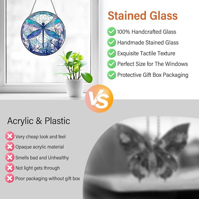 - 【Stained Glass Window Hanging】This is a very beautiful dragonfly decor sun catchers indoor window decorations with a size of 6x6 inches which is perfect for windows, adding a touch of color without obstructing the view outside. This piece of glass was cut individually and painted by hand. It is skillfully handmade, and it is real glass, NOT plastic or acrylic.