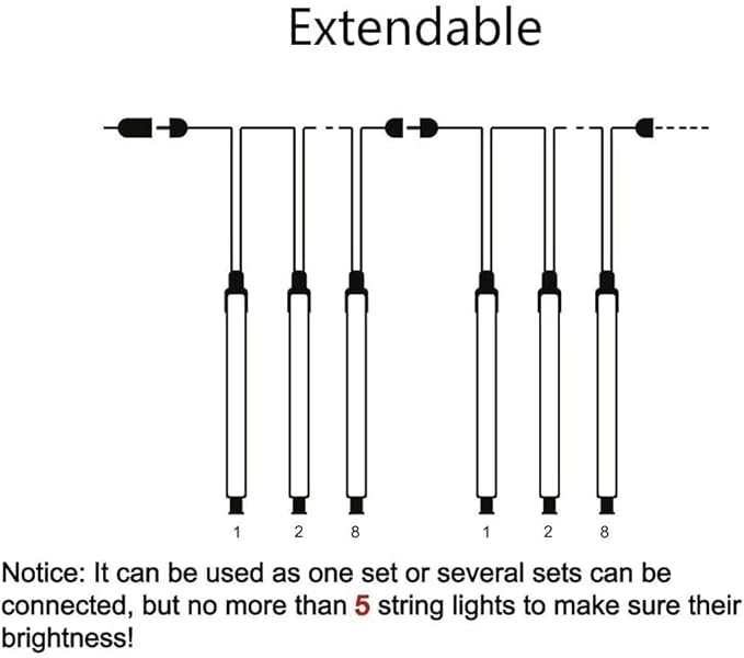 - 【Connectable Christmas Decorative Lights】Each string of our Christmas lights is like a shooting star in the night sky, slowly falling, creating a romantic and dreamy atmosphere, very beautiful. These icicle string lights can be used individually or connected (3-4 strings work best). If the whole 8 tubes do not light up when connecting more than one set, please check if the male and female connectors are connected correctly.