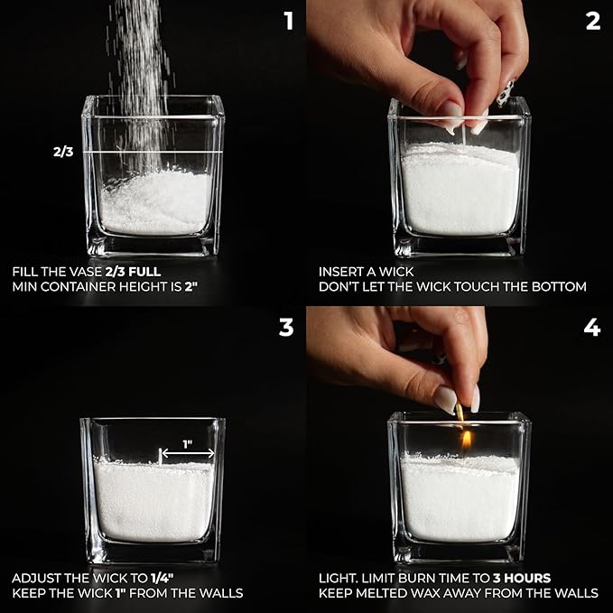 - Included Components : Glass container, 16 oz (450g) candle wax powder, 30 cotton wicks, Instruction booklet