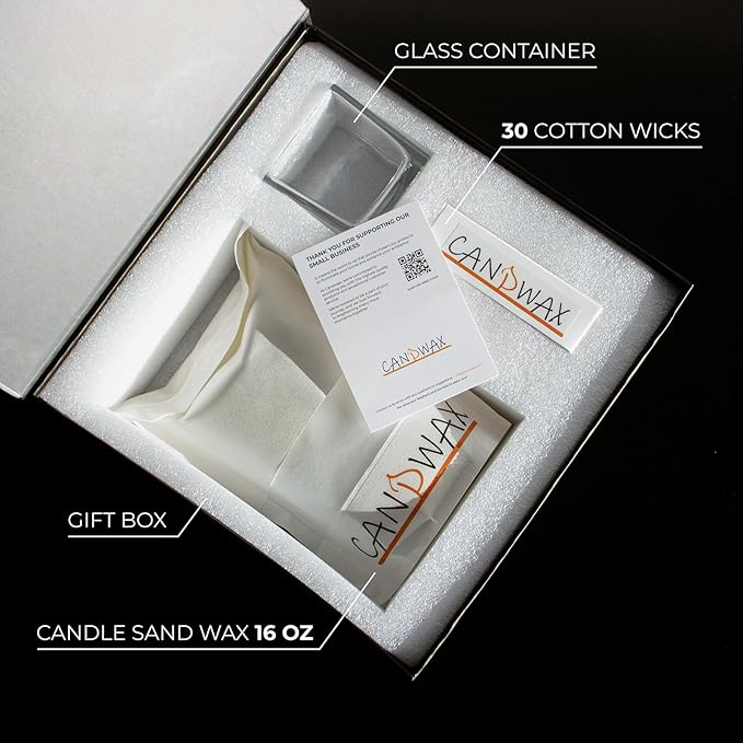 - Complete Gift Set. Sand candle set kit included everything you need to get started: a stylish glass container, 16 oz (450g) of candle wax powder, 30 cotton wicks, all elegantly packaged in a black gift box. Powder candles with wicks are perfect as a thoughtful, customizable, and versatile gift for women, gift for mom or birthday gift