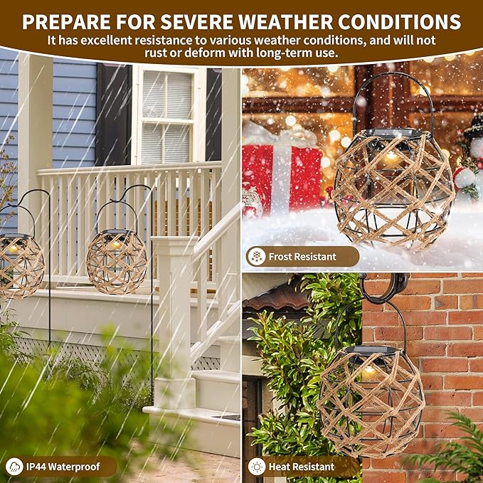 - 【Waterproof Solar Lights for Outside】:The solar lanterns are lightweight and sturdy, with a waterproof rating of IP44, making them unaffected by most weather conditions. High-quality materials ensure long-lasting performance. Please keep them away from fire or high temperatures.