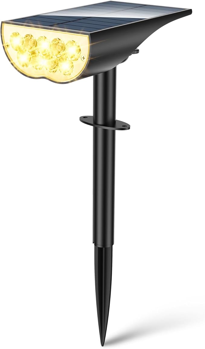 - Solar Powered & Auto On/Off:Featuring large area solar panel,our solar garden light can easily capture the sunlight and store the energy with a charging conversion rate of 19.6%. 120° adjustable light head help you precise illuminate wherever you need. Built-in light sensor can detect brightness change, so the outdoor spot lights can automatically turn off at dawn and then light up your home every evening