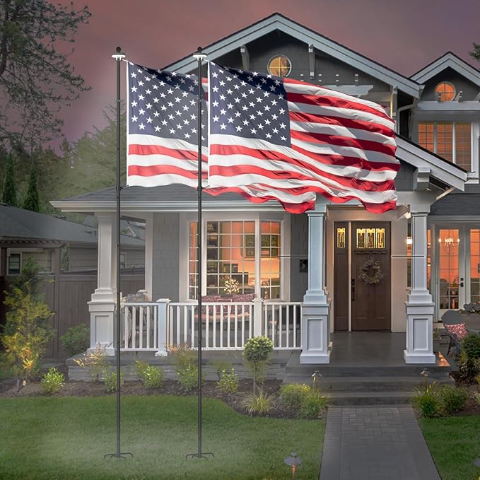 - Flagpole with Light: This 10 FT flagpole is made of corrosion-resistant metal for durability. The solar light kit, with upgraded sensors, charges during the day and automatically illuminates your flag at night, shining a light on your flag