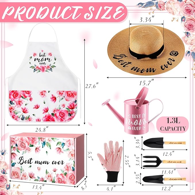 - Gardening gift set for mom: This gardening gift set includes a pink metal watering can, a straw hat, a soil shovel, a transplanting shovel, a cultivator, a pair of gardening gloves and a rose pattern apron. Packaged in a rose-patterned gift box, it's the ideal gift for any mum who loves spending time in the garden.