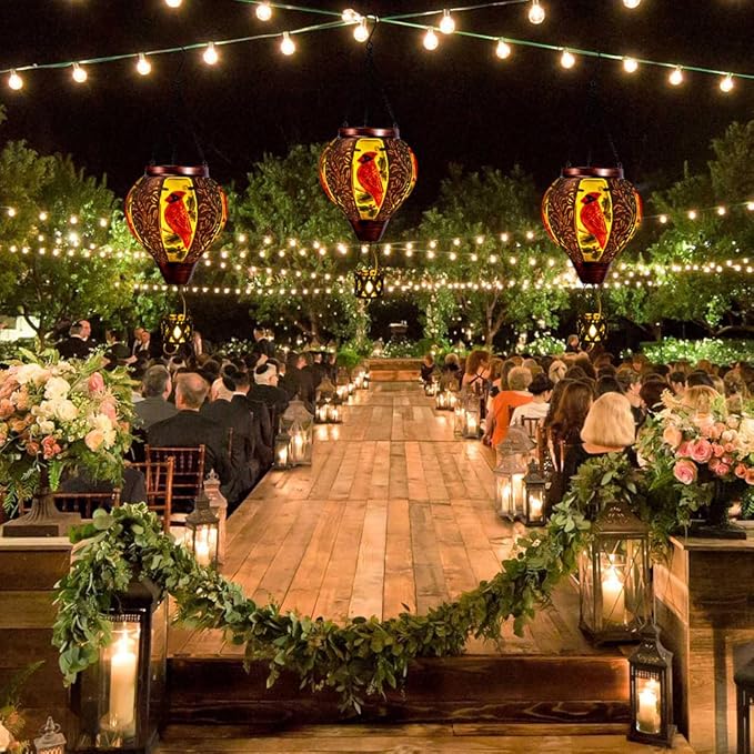 - 【Cardinal Decor】Bring the beauty of nature into your yard with this captivating cardinal hot air balloon solar lantern. Crafted with intricate details, it features a vibrant red cardinal perched amidst lush pine branches and golden accents. Suspended by elegant chains, this solar hot air balloon lantern with flame casts a warm, inviting glow at night.