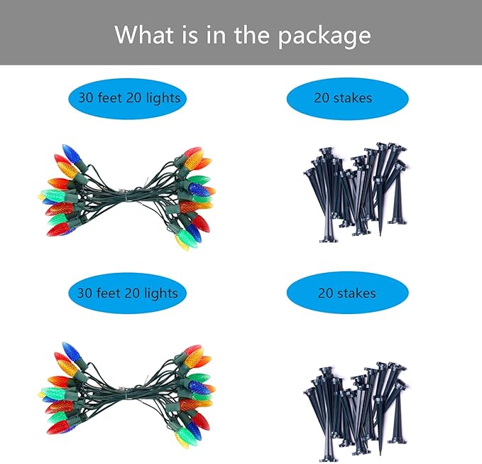- 2 Pack C9 LED Pathway Lights - MAINDECO C9 Christmas walkway lights are 30 feet long in total which contain 20 Multi-colored C9 LED SMD strawberry faceted bulbs with 18 inches spacing, 20 Stakes, E17 base sockets. After installing the ground stakes, it can be fixed in the ground to add Christmas holiday lights to your yard, garden and pathway, etc.