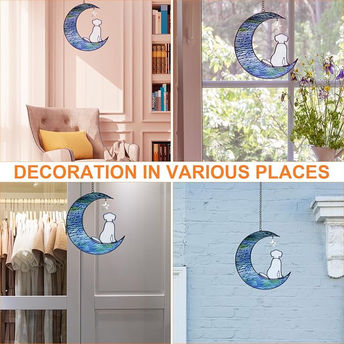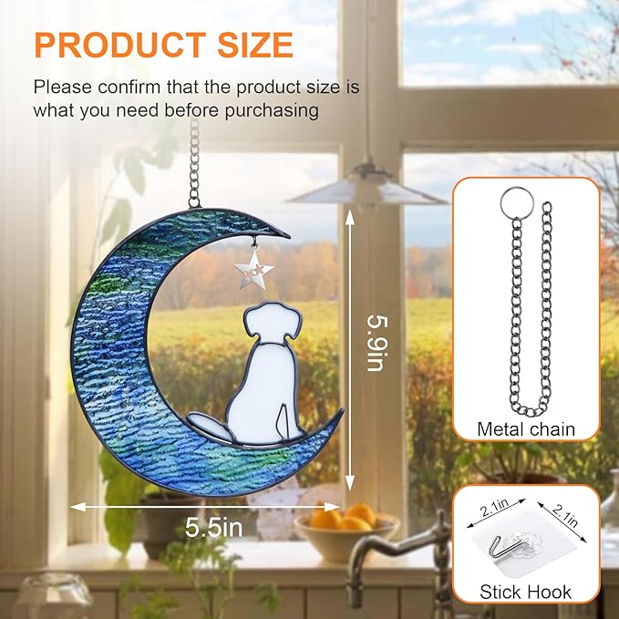 • 🐾【Easy To Hang Pet Memorial Suncatcher】Each stained glass window hangings dog grief gift will be packed in a box, included iron chain and sticky hooks. Dog bereavement gifts size:5.5''x5.9'', 1.2" sticky hooks.You can indoor window hanging for bedroom, bathroom, kitchen, cafe, office, classroom, porch, balcony, etc.