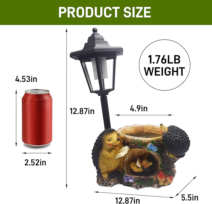 - 【Two In One Design】: The cute hedgehogs garden statue not only has solar lights to add atmosphere to your yard, but also has a unique planter design, which can be used for planting and as a storage container, providing more fun for your garden