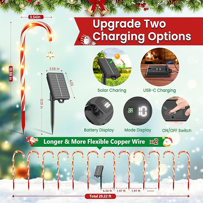 - Made to Last and Waterproof Construction: Built to withstand the elements, our outdoor Christmas lights feature high-quality ABS material, durable stakes, thick candy cane structures, tightly sealed copper wiring, and a robust solar panel. With an IP65 waterproof rating, these led christmas lights are perfect for outdoor use, ensuring longevity and reliability in any weather condition