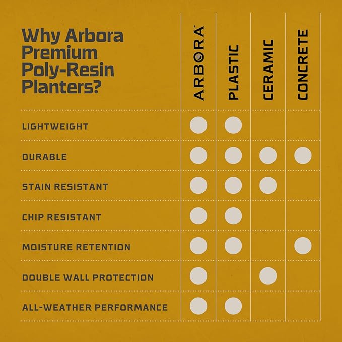 - Weatherproof & Durable - Constructed with resilient resin, Arbora pots are weatherproof and fade-resistant, maintaining their integrity season after season. Featuring double-walled insulation, experience superior plant protection in any weather.