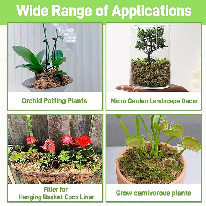 - 【Versatile】Sphagnum moss for reptiles is incredibly versatile, suitable for terrarium crafts, egg-laying and incubation mediums, and as a substrate for reptile. It's perfect for floral designs, mini gardens, air plant terrariums, hanging basket liners, wreath decorations, miniature landscapes, and as filler for faux houseplants.