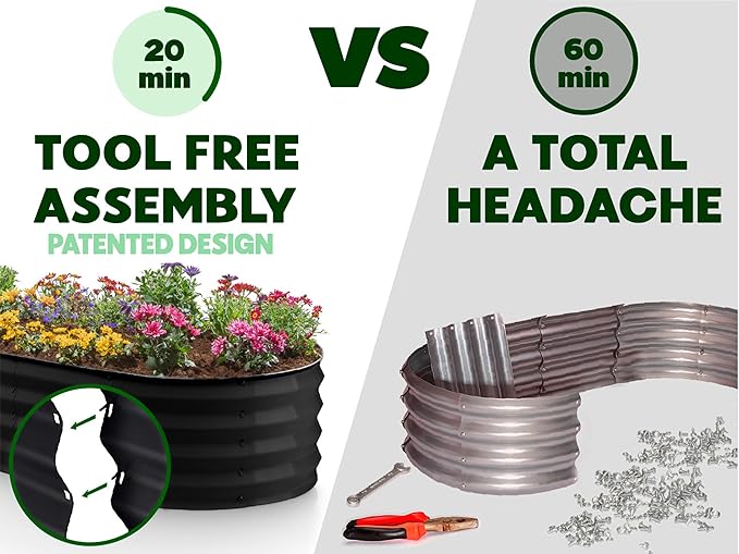 - EFFORTLESS ASSEMBLY, LIKE NO OTHER! Begin your planting journey by choosing our innovative patented design, featuring the perfect combination of easy assembly and durability. Thanks to our unique tool-free design, assembly is a breeze and can be completed in just 20 minutes! Get started on your garden right away and enjoy fresh, healthy produce in no time.