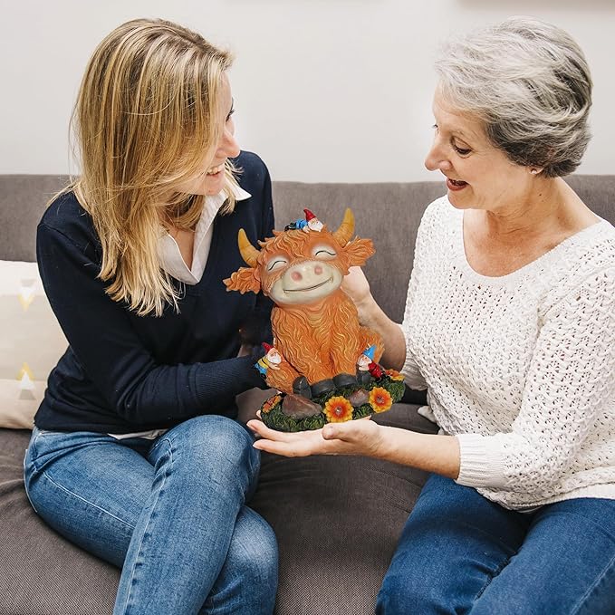 - Add a little personality and a good dose of fun to your outdoor space with this highland cow statue. Great birthday housewarming Christmas gifts for mom,friends,grandma,colleague.