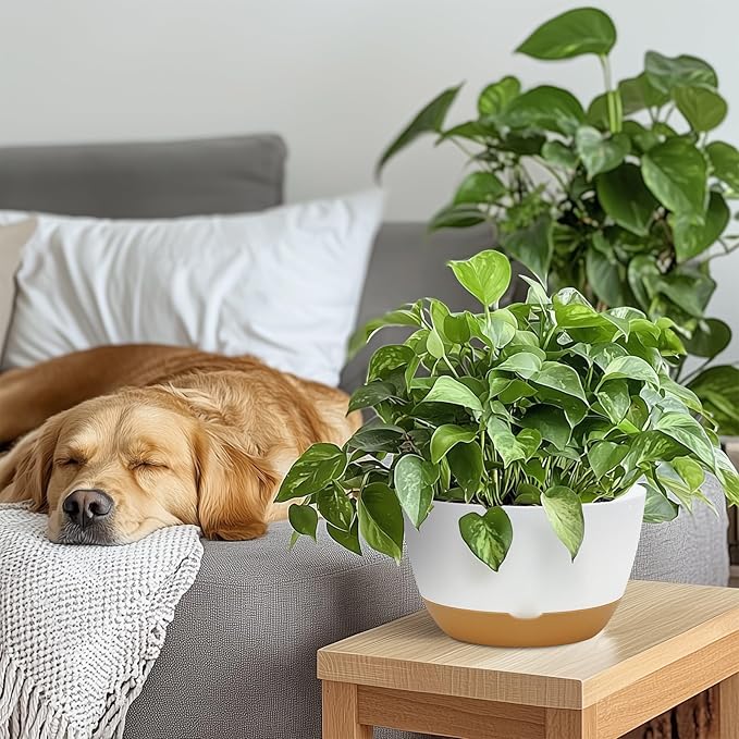 8 Inch Pots for Indoor Plants, Self Watering Planters with Drainage and Saucers, Plastic Outdoor Flower Pot, Set of 2, White