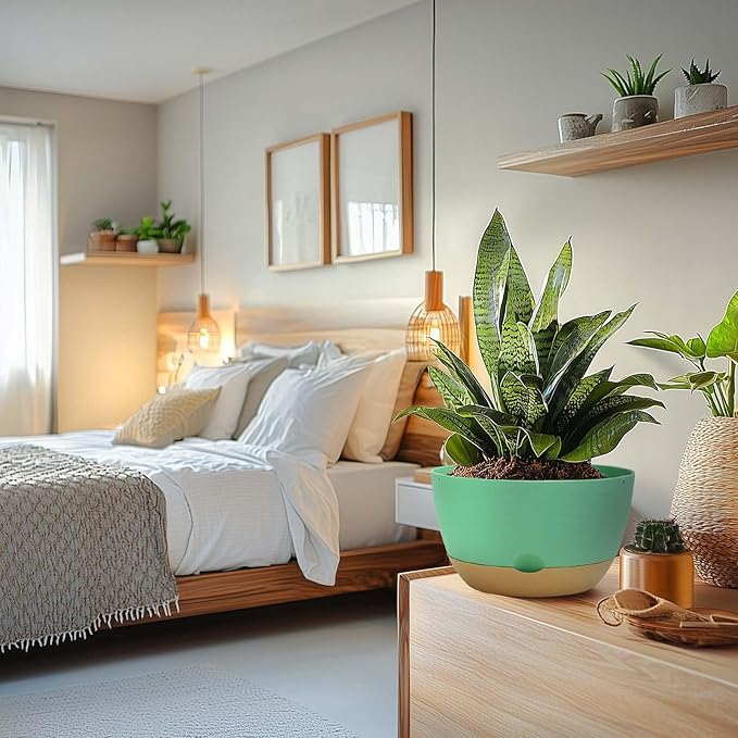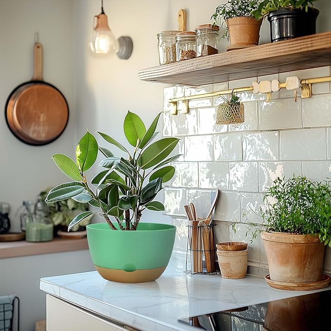 8 Inch Pots for Indoor Plants, Self Watering Planters with Drainage and Saucers, Plastic Outdoor Flower Pot, Set of 2, Green