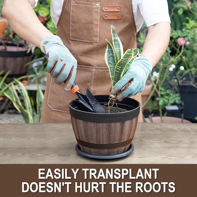 8 Pack Plant Pots with Drainage Holes, Include 8 of 9 inches Flower Pots with Saucers, Plastic Imitation Wine Barrel Design for Indoor Outdoor Garden Home Plants