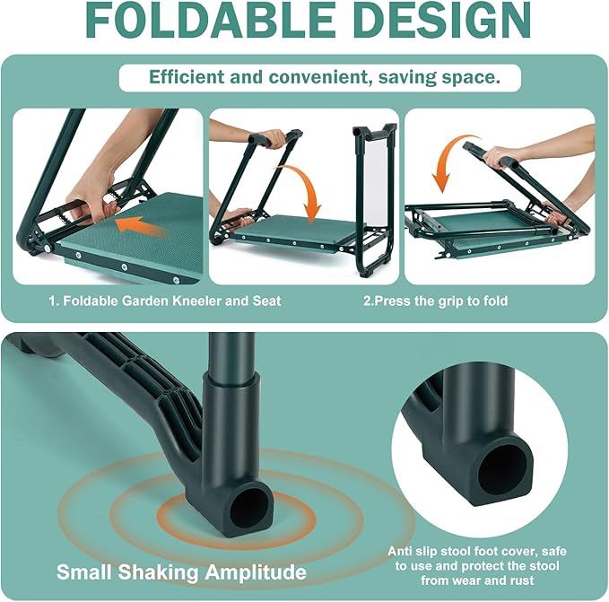 - 🌼【 Foldable Design and No Assembly Required】 Enjoy the convenience of our garden kneeler and seat with its foldable design that requires no assembly. Simply open or fold the gardening stool effortlessly, allowing for easy storage. Hang it on a wall in the garage, workshop, or any convenient space when not in use.