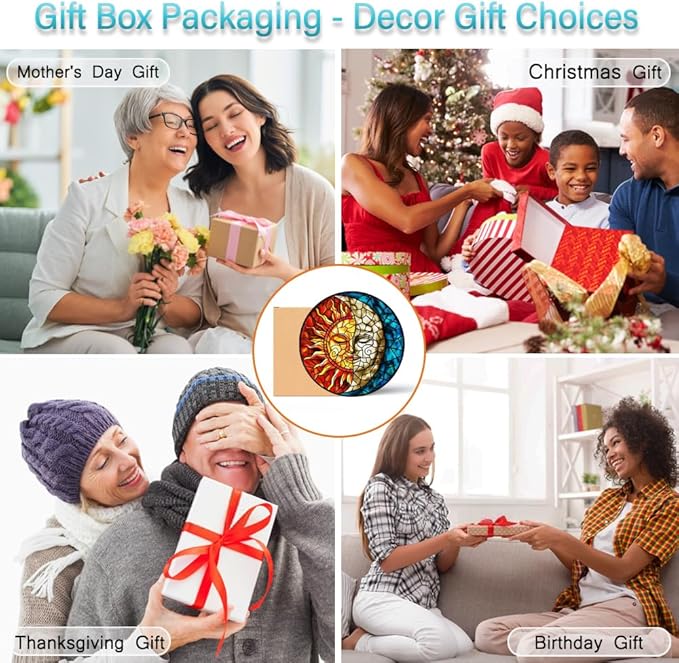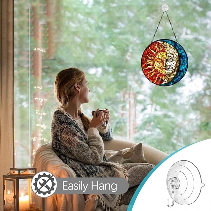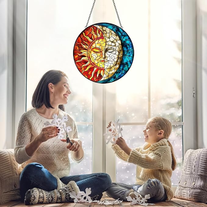 - Stained Glass Material: Window hanging is made with high-end stained glass, compared to acrylic materials, the colors are more vibrant. Tufeu sun and moon stained glass suncatcher captures sunlight with excellent light transmission, displaying vibrant colors. The flat patterns are clear, and the image softens when the diamond dots faces outward, exquisite and beautiful