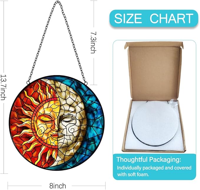 - Valentines Day Decorations: The upgraded large-size glass panels hanging bring you a new decorative experience. This is a very beautiful sun moon suncatchers, size is 8 inches which is perfect for any windows or wall space. Stained glass window hanging is the right size to enhance your home decor without blocking the view, it is a good choice for decorating a house