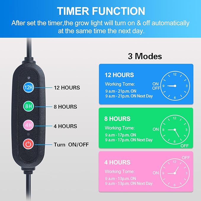 - Timer for Auto On/Off Plant Grow Light---4/8/12H Timer Grow Lights for Indoor Plants. Auto On/Off Every Day Just as You Need.