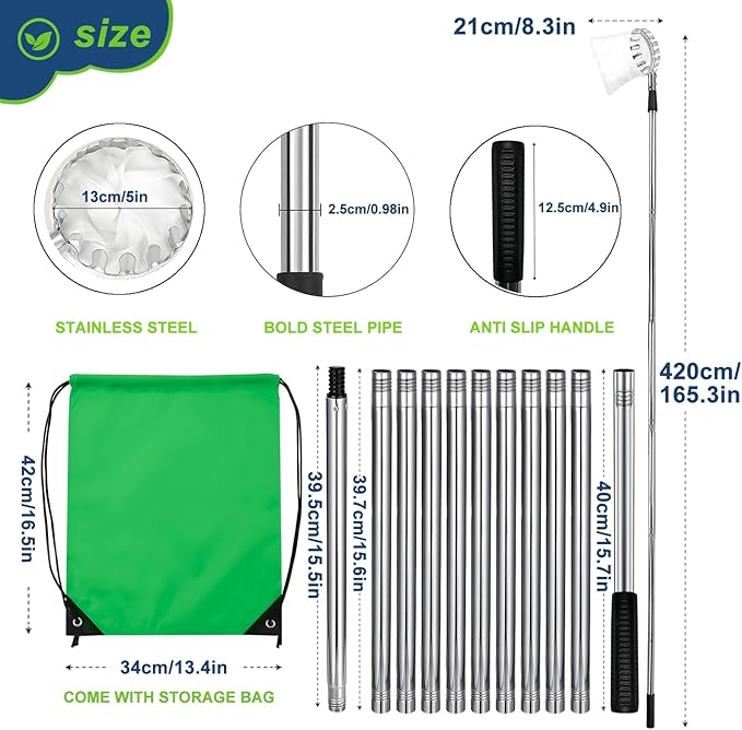 - Length Adjustable Pole: This fruit picking tool is constructed with 11 interconnected stainless steel rods. You can adjust the total length of the rod by increasing or decreasing the number of rods, enabling safer and more efficient fruit harvesting from tall trees without the need for ladders or tree climbing.