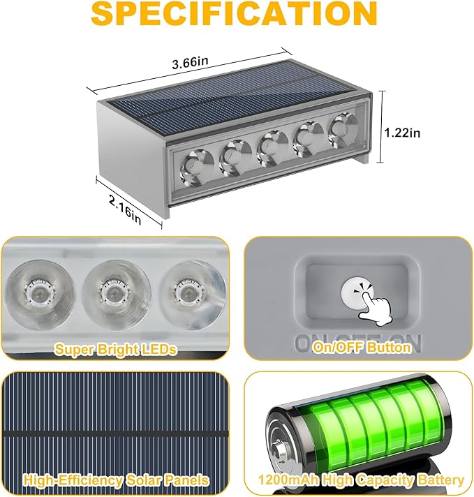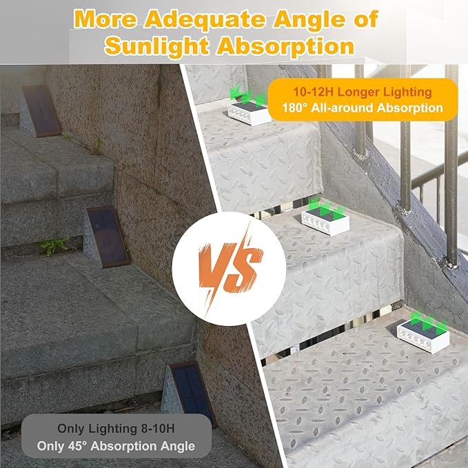 - 【10-12H Long Lighting】T-SUN solar LED step light come with better heat-resistance PC&ABS and high-quality solar panel in the case of sufficient sunshine, the solar stair lights automatically charging 6-8 hours during the day, which is enough to supply power to the outdoor step light for up to 10-12 hours at night.Note: Please turn on the switch of the bottom of the light before using.