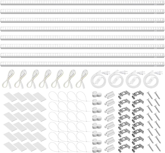 - What You Get: 8 x Barrina T5 Grow Lights, 4 x Power Cords with ON/OFF Switch, 7 x Connecting Cords (20''), 8 x Small Connectors, 16 x Installation Clips, 16 x Double-sided Tapes, 24 x Cable Ties, 8 x Dustproof Cap