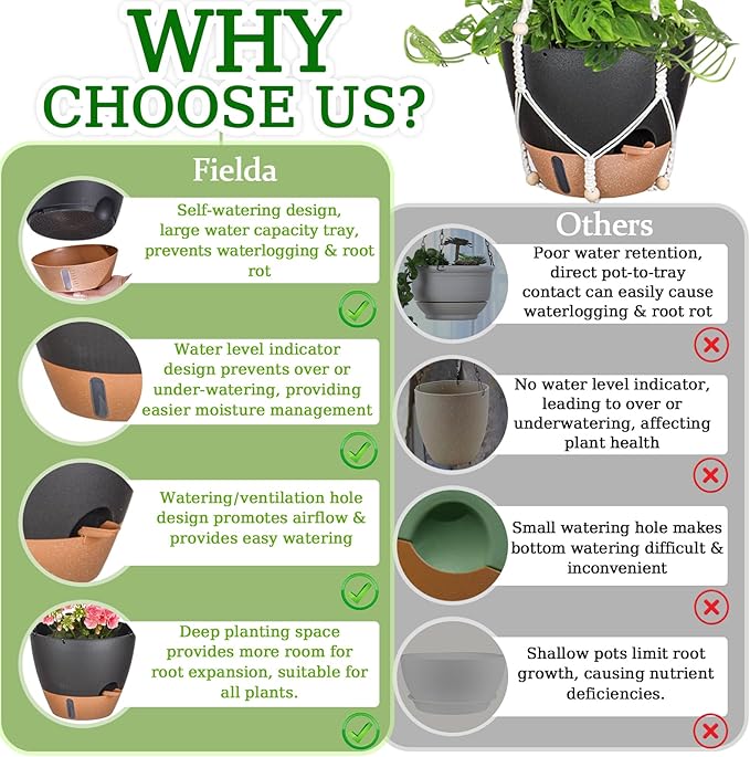 - 【Water Level Indicator Design】Unlike other hanging planters, Fielda hanging plant pot features an innovative design with a specially crafted visible window in the bottom tray, allowing you to monitor the water level at any time. This way, you can prevent plant damage from underwatering or overwatering with ease.