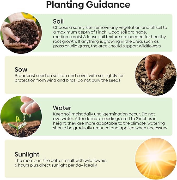 - High Quality Packaging: Our seed packs are resealable and provide optimal storage conditions to keeps seeds fresh. Our packaging material is aluminum foil, waterproof and moisture resistant. The planting instructions are displayed on the back of each package, You can also use our online guide to Learn how to grow wildflowers like a professional gardener