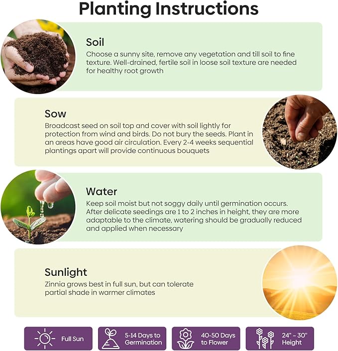 - Freshest Zinnia Seeds: Groundio zinnia seeds are sown directly into the garden after the last frost and are easy to grow, they require little care. Not heading can promote more flowering, We offer the freshest seeds to enhance the quality of your garden, we ensure a high germination rate, 99% pure live seed, no filler