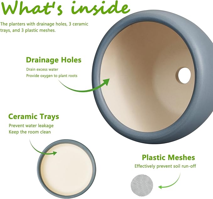 - Drainage Holes and Accessories: Each ceramic planter pot has a drainage hole at the bottom, a mesh, and a ceramic tray for collecting water. This will provide ample oxygen to the plants
