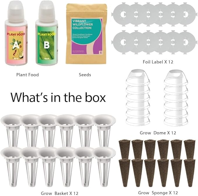 - 【All-IN-ONE Home Garden】These hydroponic pods provide everything you'll need to start your indoor home garden. 7 types of 350+ vibrant wildflower seeds, 12 growing sponges, growing baskets, growing domes and pod labels, 200ml A&B plant food. It's suitable for both beginners and experienced gardeners