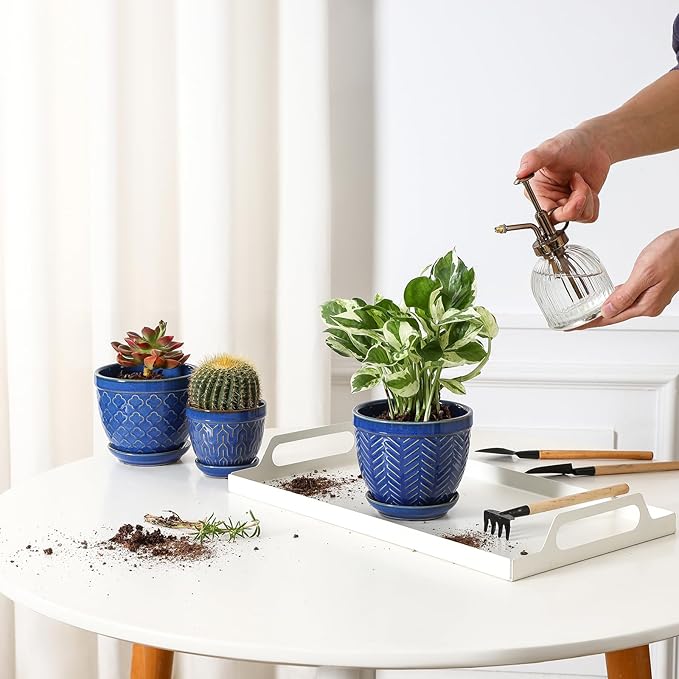 - Minimalist Design of Houseplant Pot: These indoor planters are designed with four different embossed patterns that make it easy to mix and match plants to create a elegant look, decorating windowsill, tabletop, shelve, kitchen, living room, bedroom, office, garden and patio. These flowerpots have a minimalist design and combination solid color glaze that blend seamlessly with a various of home styles