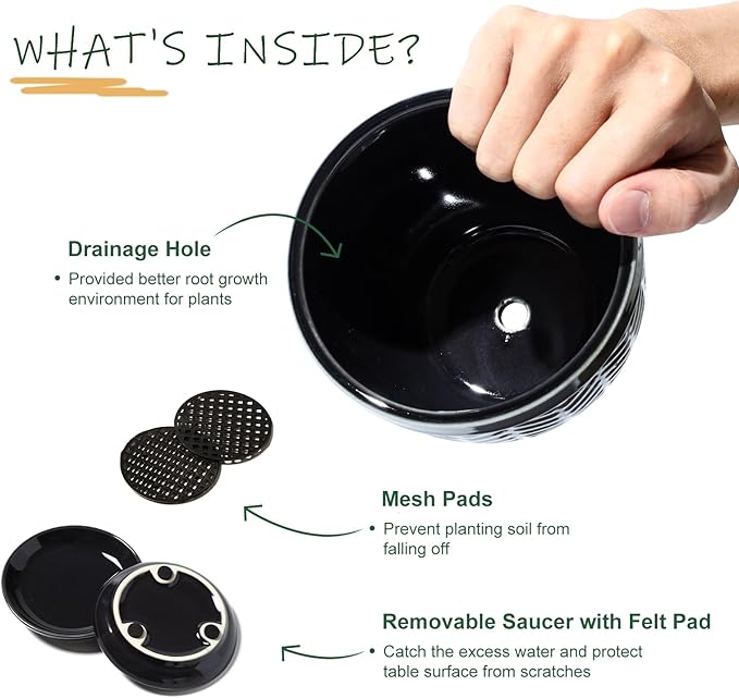 - Ceramic Plant Pots with Drainage Hole: Each small plant pot measures 3.5''W*2.8''H , which is the ideal for growing small and medium sized plants, such as succulents, snake plants, cactus, orchid and small flower. The flower pots has a central drainage hole and saucer to ensure adequate drainage and ventilation to avoid root rot, and include a 1.7 inch diameter mesh to prevent soil from falling out