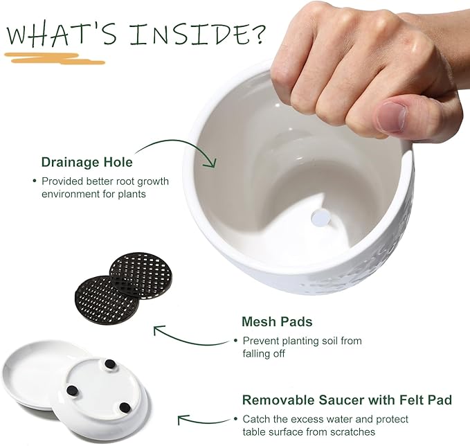 - Ceramic Plant Pots with Drainage Hole: Each small plant pot measures 4.7’’W*3.7’’H , which is the ideal for growing small and medium sized plants, such as succulents, snake plants, cactus, orchid and small flower. The flower pots has a central drainage hole and saucer to ensure adequate drainage and ventilation to avoid root rot, and include a 1.7 inch diameter mesh to prevent soil from falling out