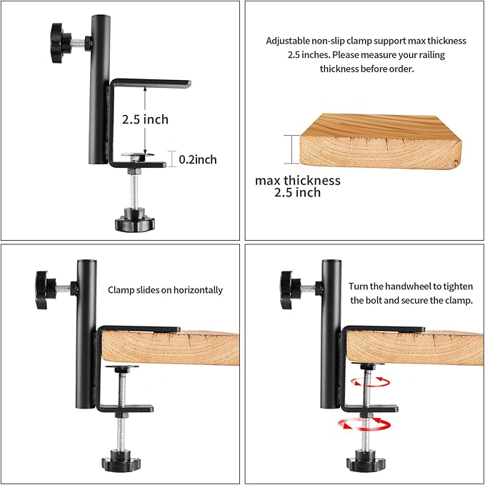 - EASY TO INSTALL: The bird feeder hook is suitable for most fences, adjustable non-slip clamp fits on horizontal railing up to 2~2.5 inch thick. No tools are needed, adjustable hand knob can be tightened and loosened quickly for easy installation and removal, also you can adjust the height and angle of the hook effortlessly. Please measure your railing thickness before order.