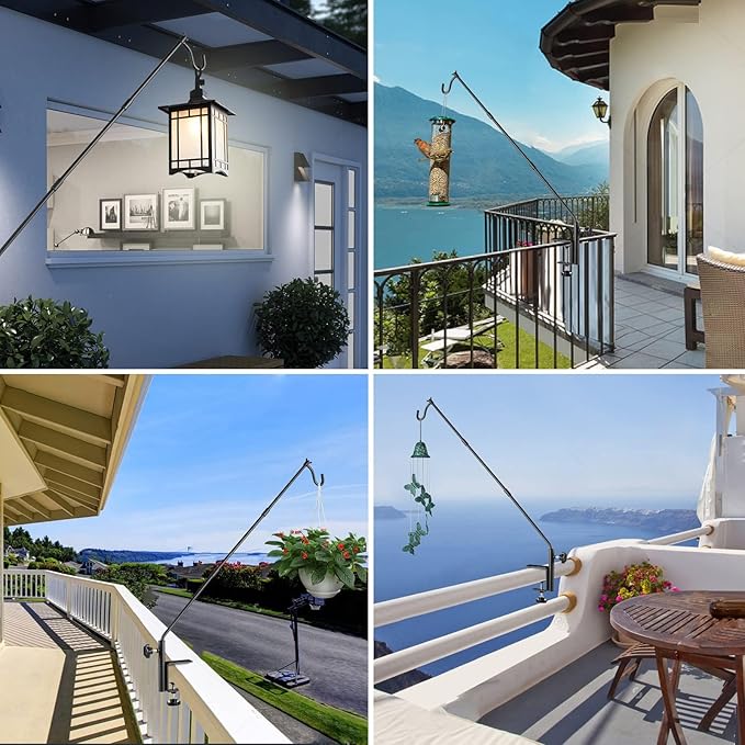 - MULTI-PURPOSE DECK HOOKS: Designed for hanging a variety of bird feeders, bird feeder pole allows you to hang your feeder away from the deck, avoiding constantly cleaning bird droppings. Also great for hanging plants, suet baskets, flower pots, wind chimes, decorative lighting and lanterns, adding elegance and beauty to your outdoor living space.