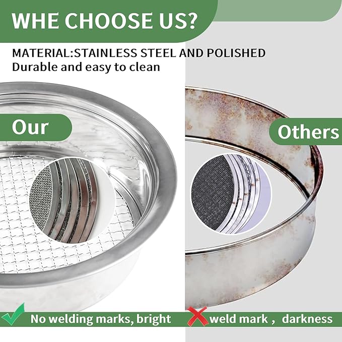 - UPGRADED MATERIAL PROCESSING:The dirt sifter is made of stainless steel with polished,durable, the pan is a whole molding, rolled edges and wrapped edges, the mesh is not welded corrosion traces, smooth and does not hurt your hands
