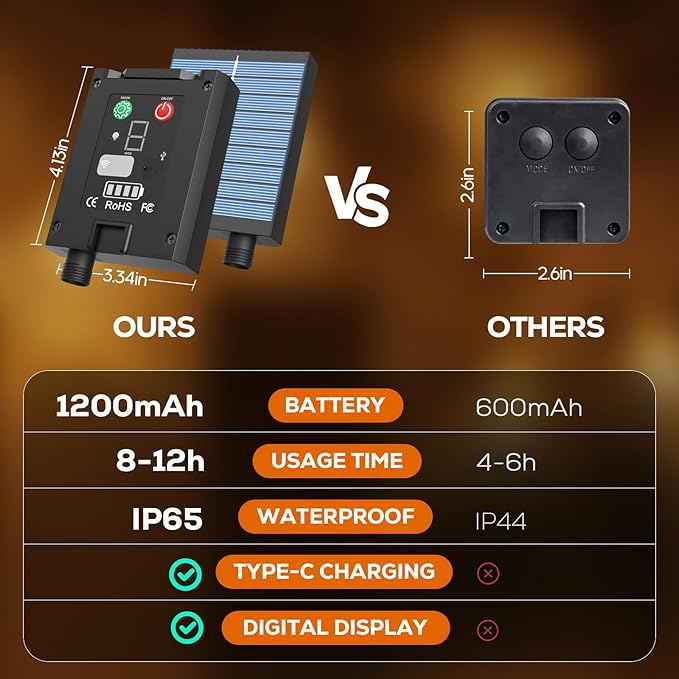 - [Larger Capacity & Longer Use Time] 1200mah large capacity solar panel, lights up for all night (15-18 hours) after fully charged; with extra USB C port (suitable for 5v adapter ), more convenient to outdoor use; modes and power display; more convenient and easy to use, suitable for all people