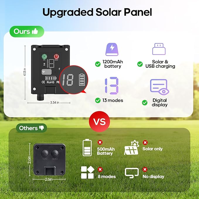 - [Larger Capacity & Longer Use Time] 1200mah large capacity solar panel, lights up for all night (15-18 hours) after fully charged; with extra USB C port (suitable for 5v adapter ), more convenient to outdoor use; modes and power display; more convenient and easy to use, suitable for all people. Total length 56 feet 100 LED, (50ft lights + 6ft extension cord)