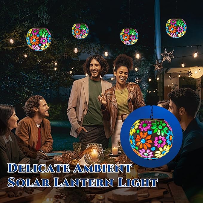 - 【Glass Mosaic Artistry】Adorn your garden with handcrafted mosaic glass gazing balls that cast vibrant floral projections through intricately arranged colored glass. Each mosaic solar hanging lantern features a durable metal chain and weather-resistant frame, blending bohemian elegance with durability for patios, yard, or garden pathways.
