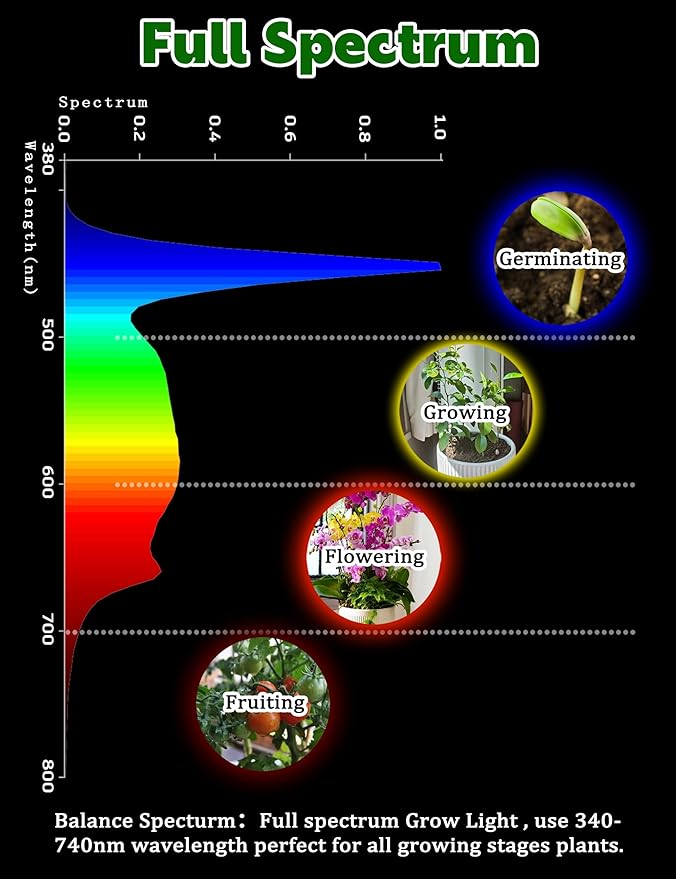 - Innovative Technology, Plant Growth Expert: Our E12 candelabra grow light bulbs uses exclusive full-spectrum LED technology, covering the entire visible spectrum of 400nm-780nm, providing: 400-499nm blue light promotes seed germination and seedling growth, 500-599nm yellow light promotes plant root growth and early germination, 600-699nm red light promotes plant rhizome growth, 620-750nm red light promotes plant stem elongation and leaf expansion, which is particularly important for plant flowering and fruit formation, 700-780nm far-red light prolongs flowering period and increases yield