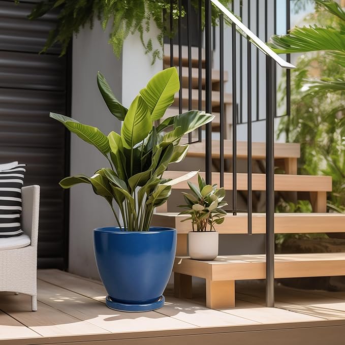 10 Inch Plant Pot - Ceramic Planter with Drainage Hole and Saucer, Modern Flower Pot, Round Planters for Indoor Plants, Home Patio Bathroom Porch Garden Living Room Decor, Blue